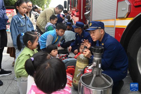 11月9日,杭州市消防救援支队滨江大队消防员向小朋友介绍消防车上灭火器材的用途。